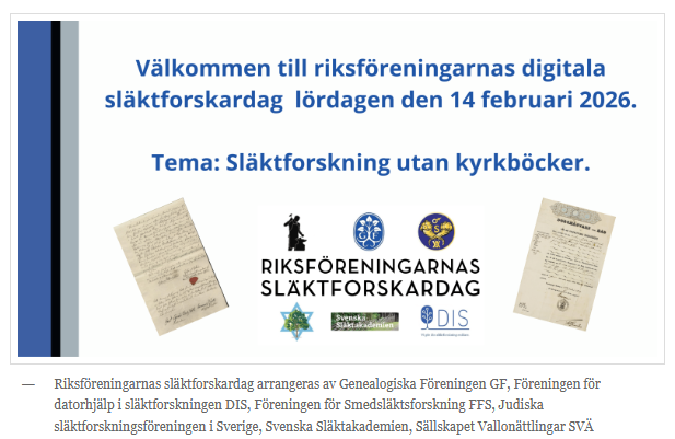 Vi planerar för en studiecirkel under våren 2026 om grunderna i Disgen.. Vi hjälper dig med att ladda ner aktuell Disgenversion vid första träffen och att flytta över din forskning från äldre versioner. Det blir 4 – 5 träffar och du använder egen dator.
